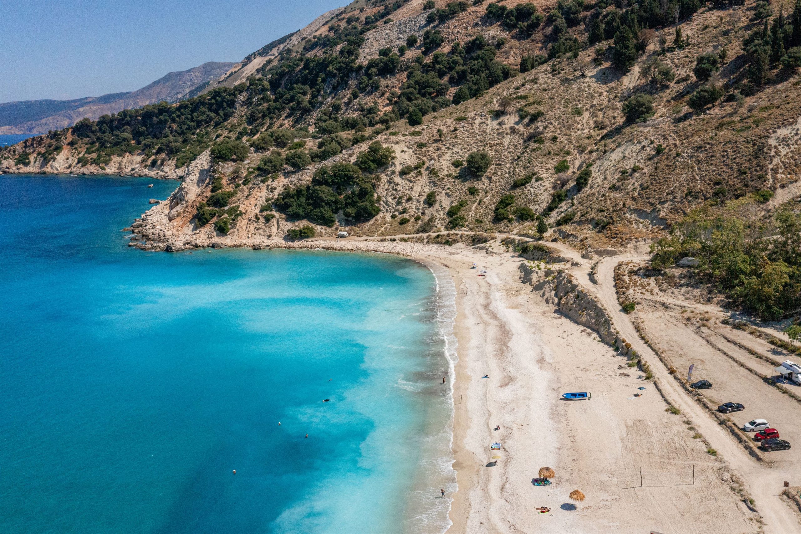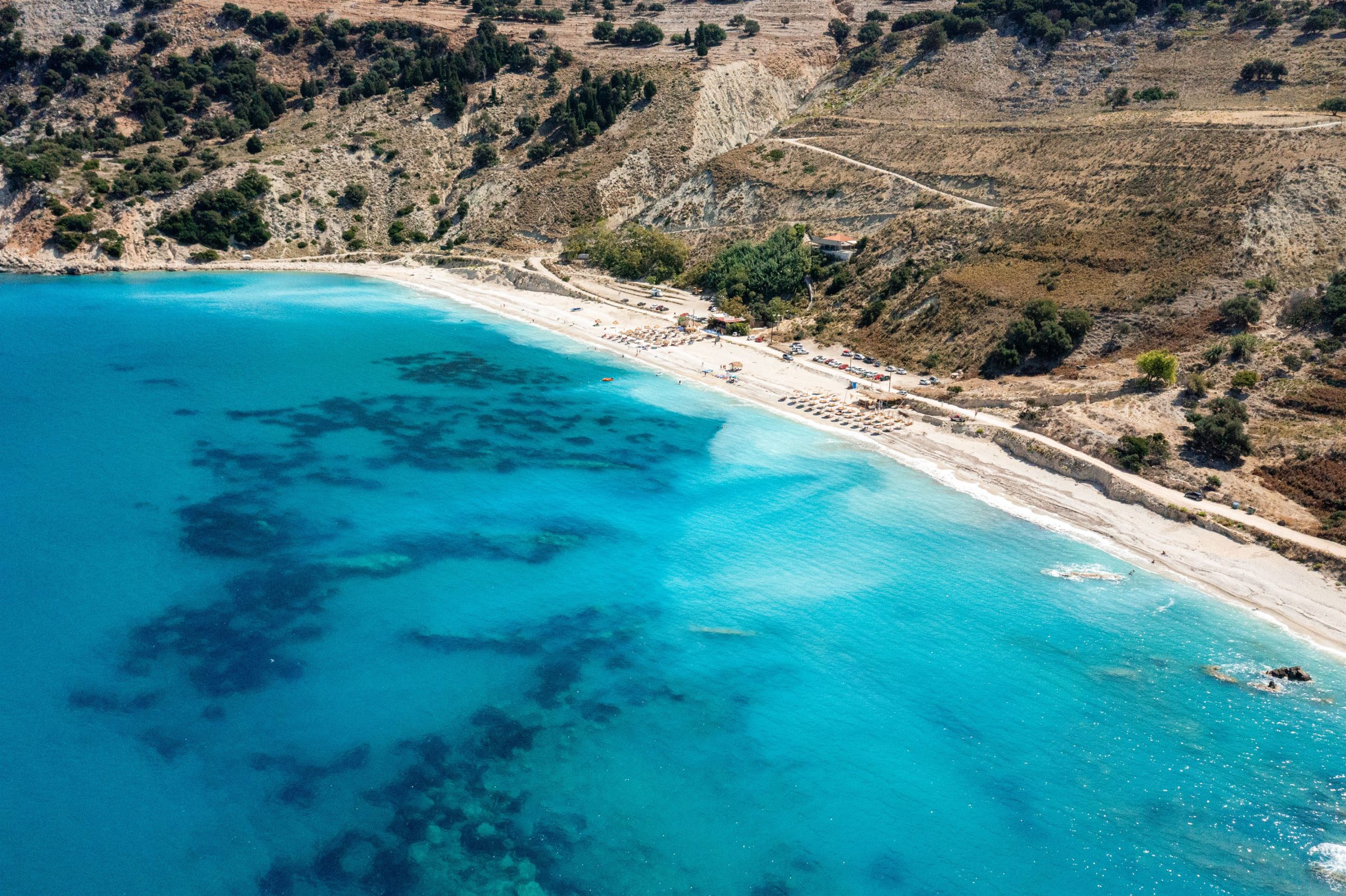 Agia Kyriaki beach is located in the northwestern part of Kefalonia Island, near Myrtos Beach, and the natural environment looks like: turquoise, deep waters and cliffs made of limestone. Typical scenery of western Kefalonia.