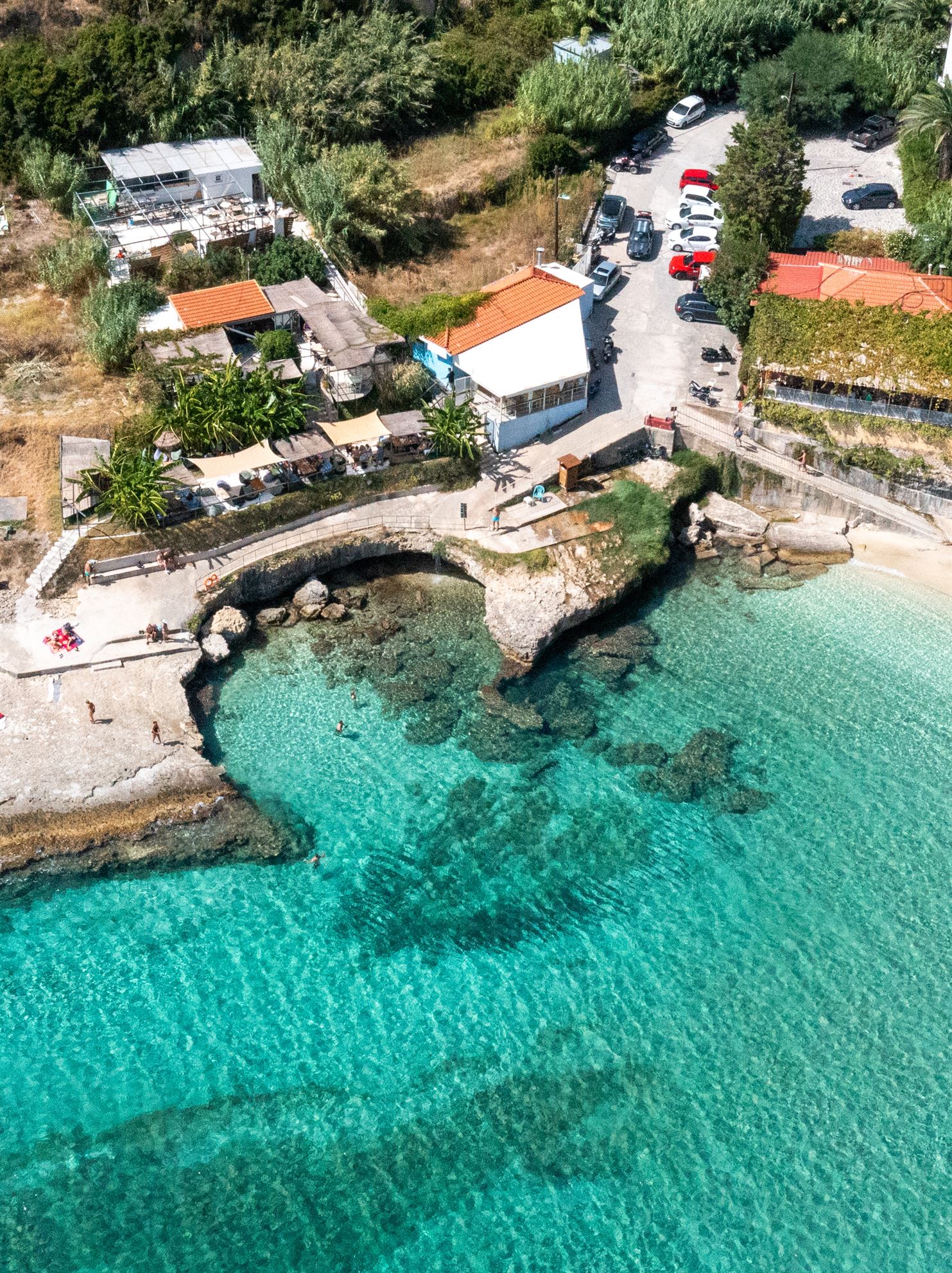 The second beach is larger and reachable through a rocky slab which is an alternative spot for sunbathing. Nearby there is a snack bar offering refreshing shadow, cold drinks and a beautiful view over the small bay. There is a reasonably sized car park. Both of these bays are surrounded by enchanting lush greenery and are quite pleasant.
