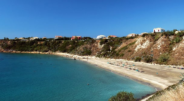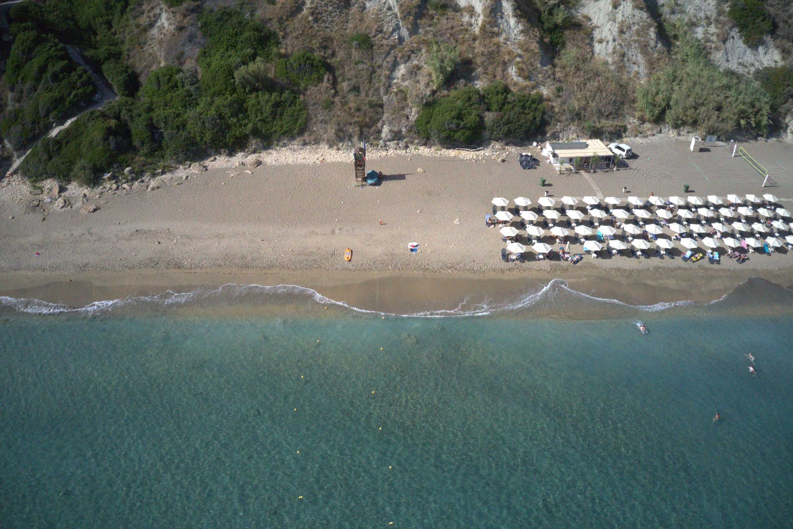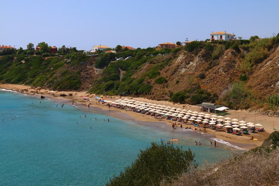 Ai chelis is sandy, large in size, and features for the visitors a lot of parasols and sun beds. The sand has the characteristic grayish color, while the water is shallow, clear, and blue. As the area is large, especially in width, it promotes water sports and games in the sand: there is a net for beach volley, while Ai Helis is preferred mainly by the lovers of racket.