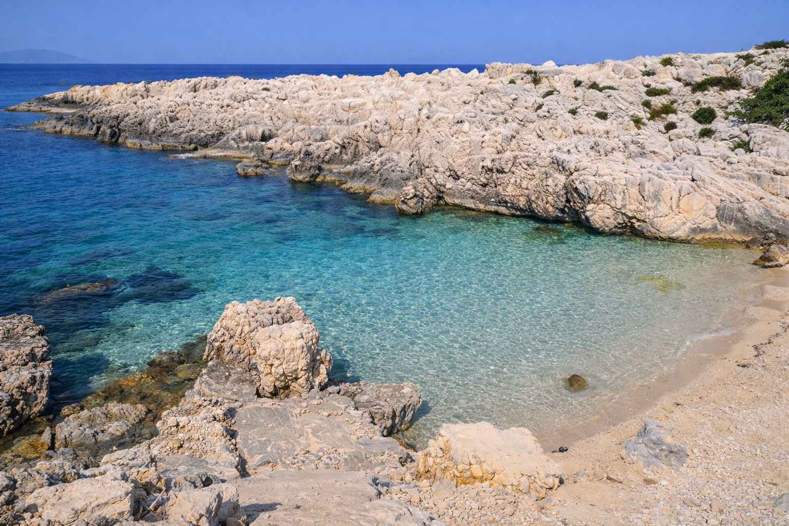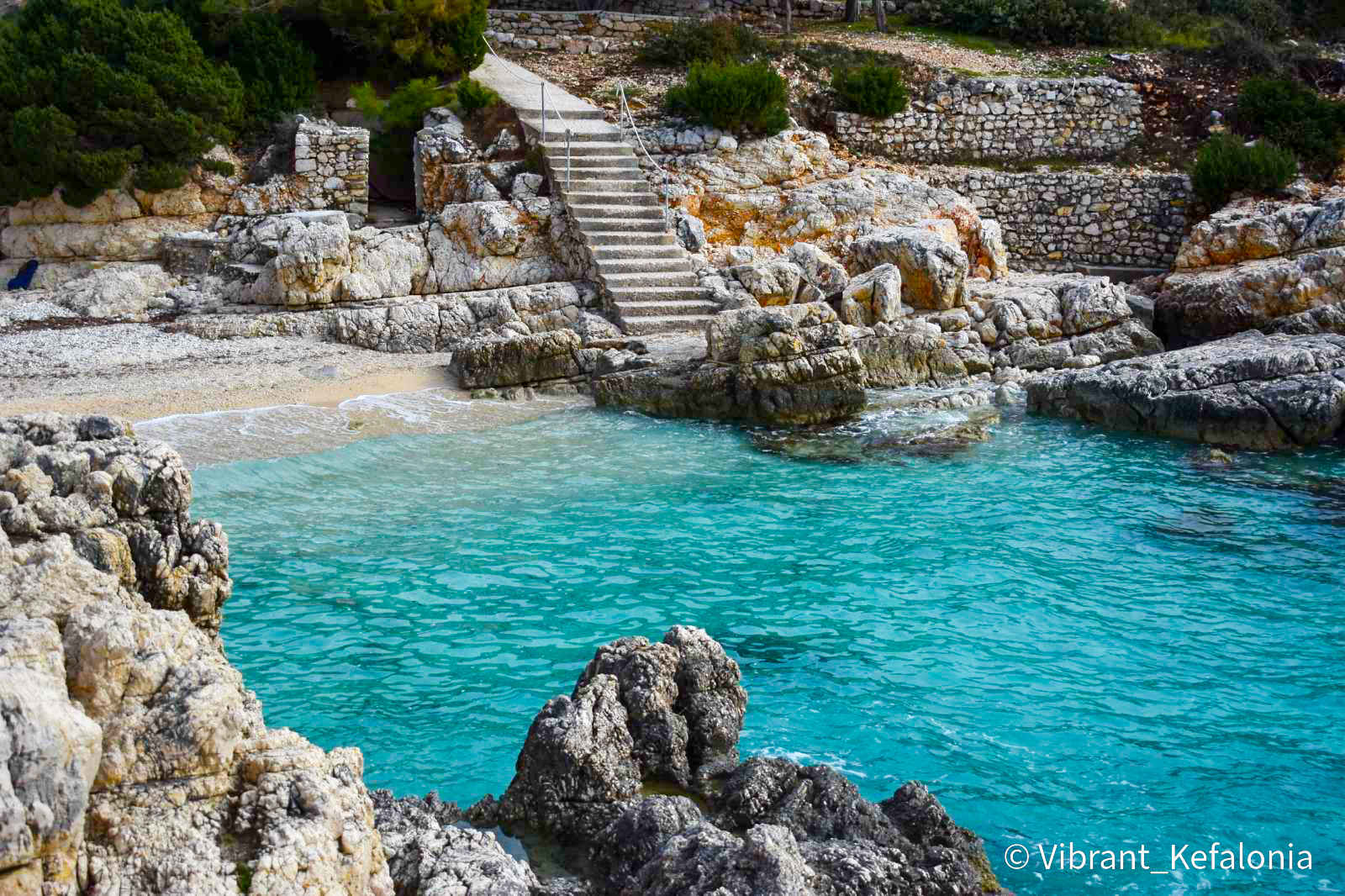 Alaties Beach in Kefalonia: Alaties is a small pebbly beach that lies well-hidden among impressive steep rocks, 45 km away from Argostoli and only a 15-minute drive from Fiscardo. It got its name from the Greek word for salt – alati. This tiny yet beautiful cove offers crystalline turquoise waters and a fascinating seabed. However, divers should be extra cautious due to the strong sea currents.