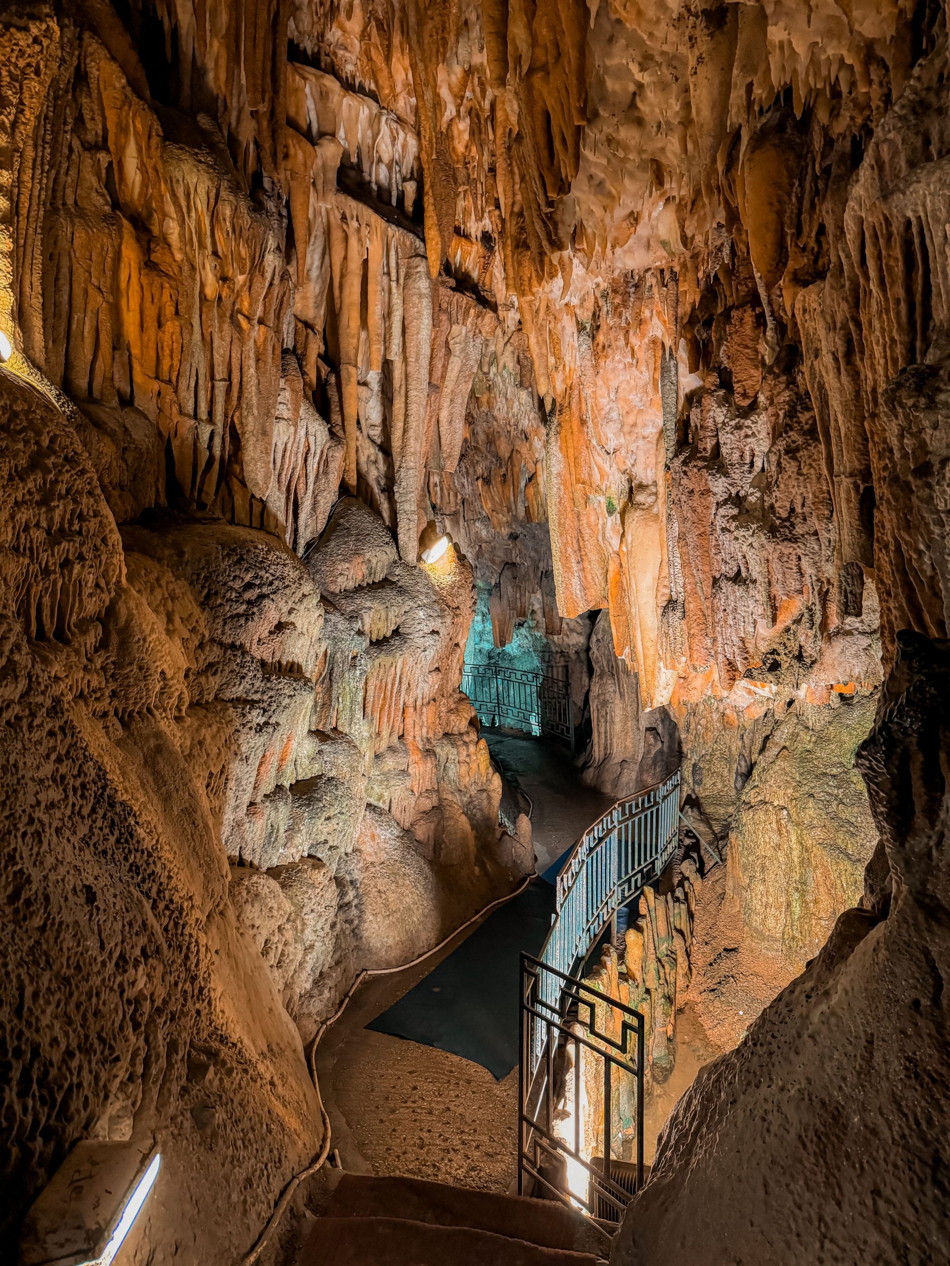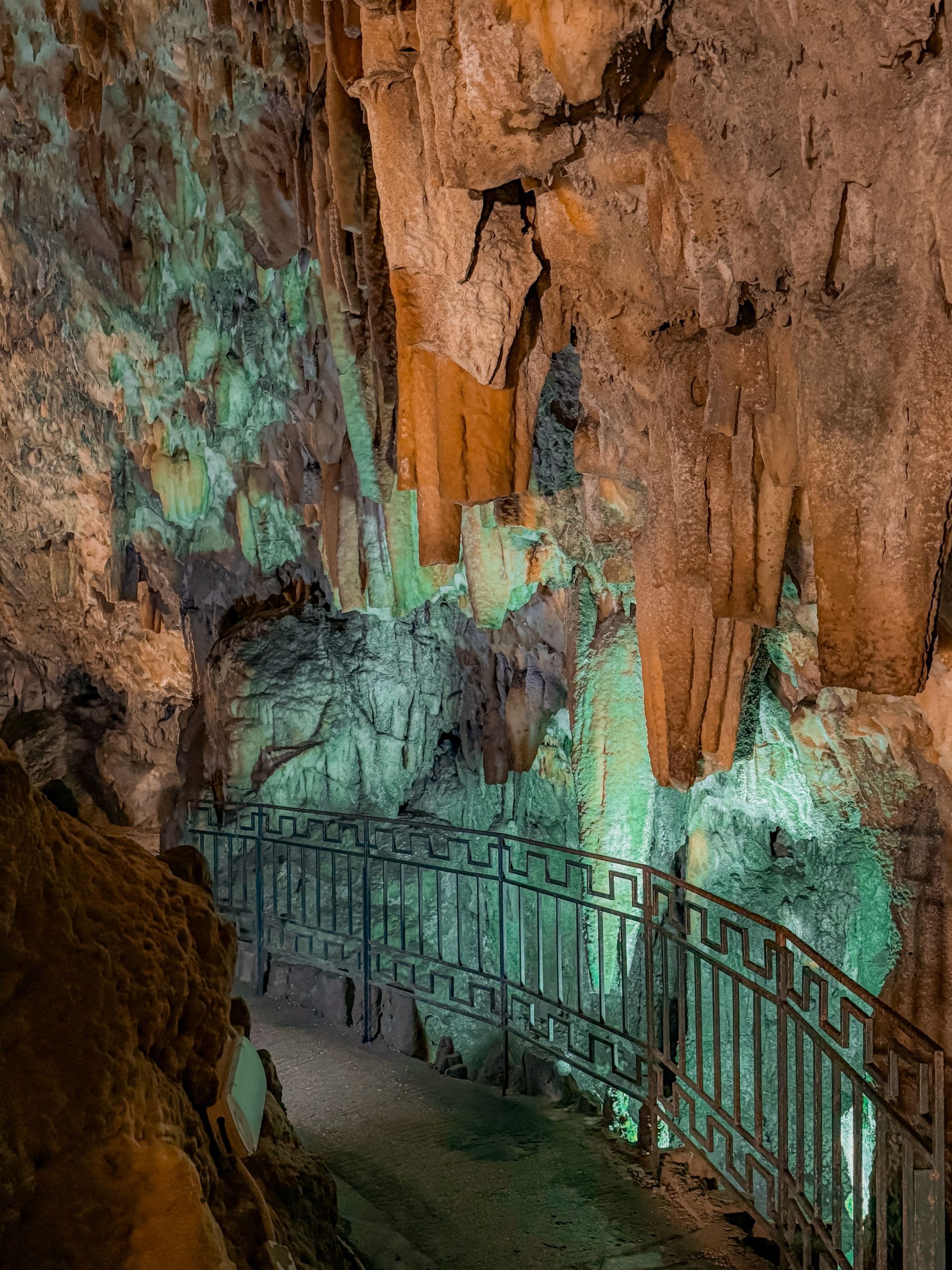 Drogarati Cave consists of two parts. The part accessible to tourists consists of a long corridor that leads to the Royal Balcony, a natural platform of stalactites that beautifully reflect the light. From there, the visitor can see the Chamber of Exaltation, which has great acoustics. This chamber is the biggest hall of the cave; it is sometimes used to host cultural events and has a room for 500 people. To move from one part to the other, you cross-colored columns and a small lake.