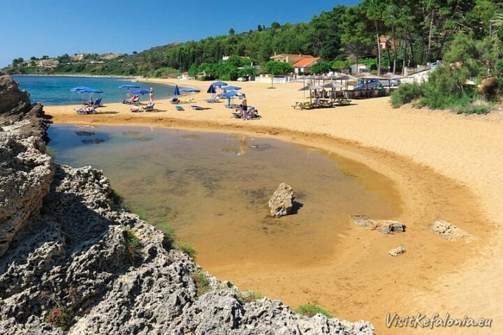 Lepeda Beach in Kefalonia: Just a brief drive away from Lixouri, Lepeda is an easily accessible beach with a bright red and orange-colored sandy shore, similar to that of Xi Beach, and a shallow seabed! It boasts natural pool formations, making it perfect for families with children, whereas it provides excellent views toward the Gulf of Argostoli and the lighthouse of Saint Theodoroi! At the end of the beach, one will find the monastery of Saint Paraksevi.