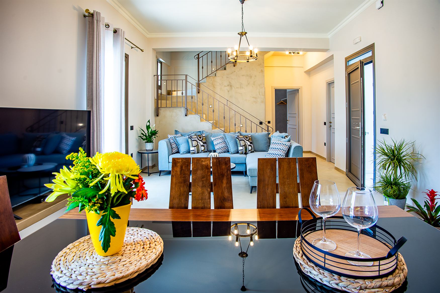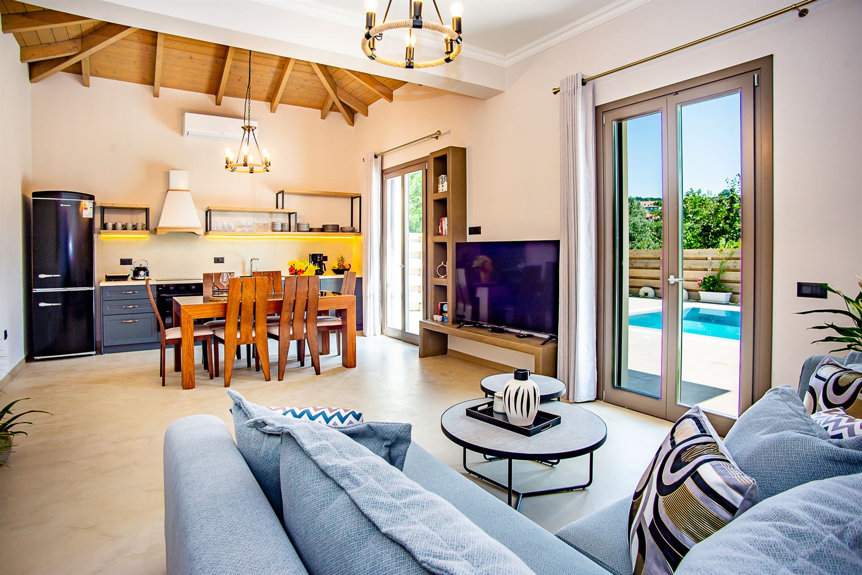 Step outside to enjoy your private swimming pool, sun loungers, and a lovely outdoor dining area, ideal for relaxed meals or evening barbecues under the Kefalonian sky.