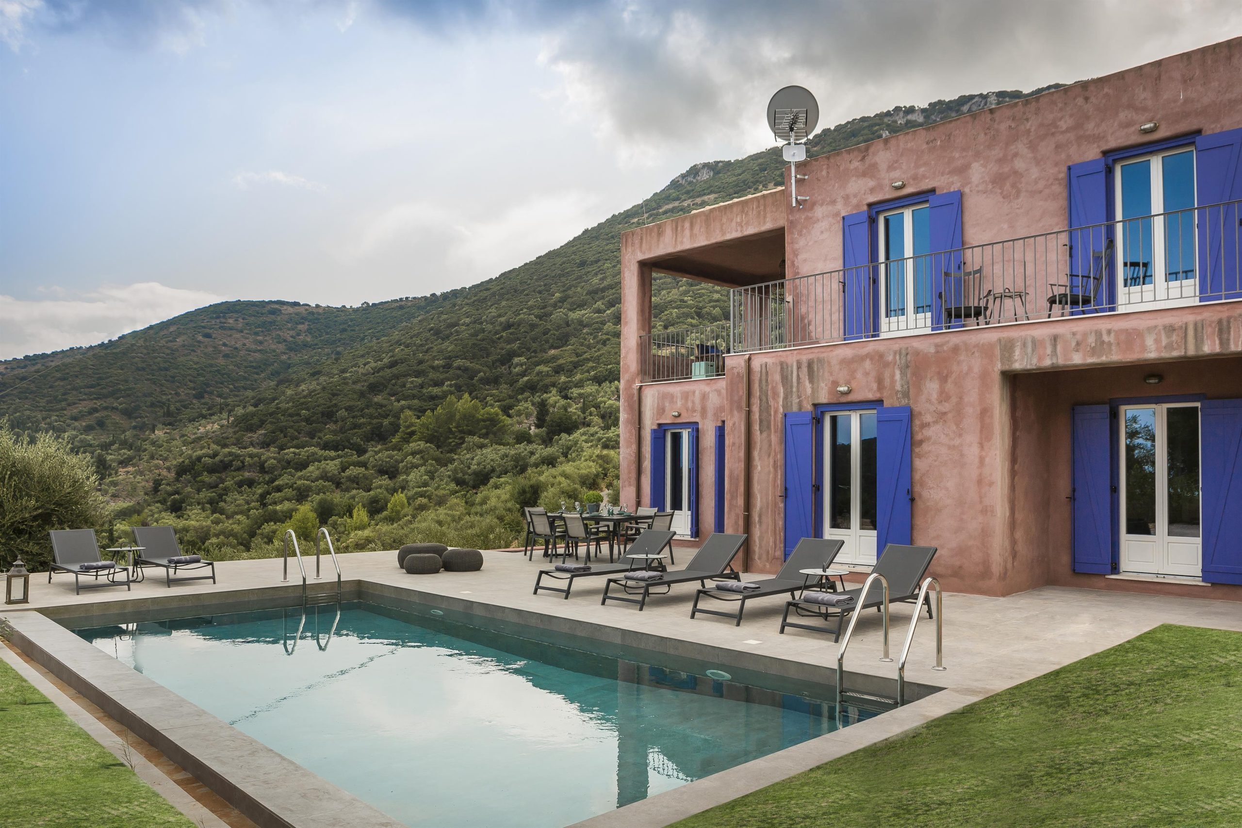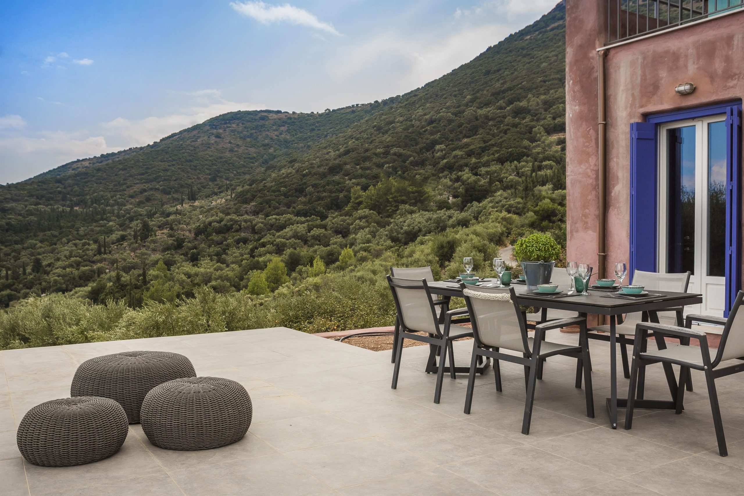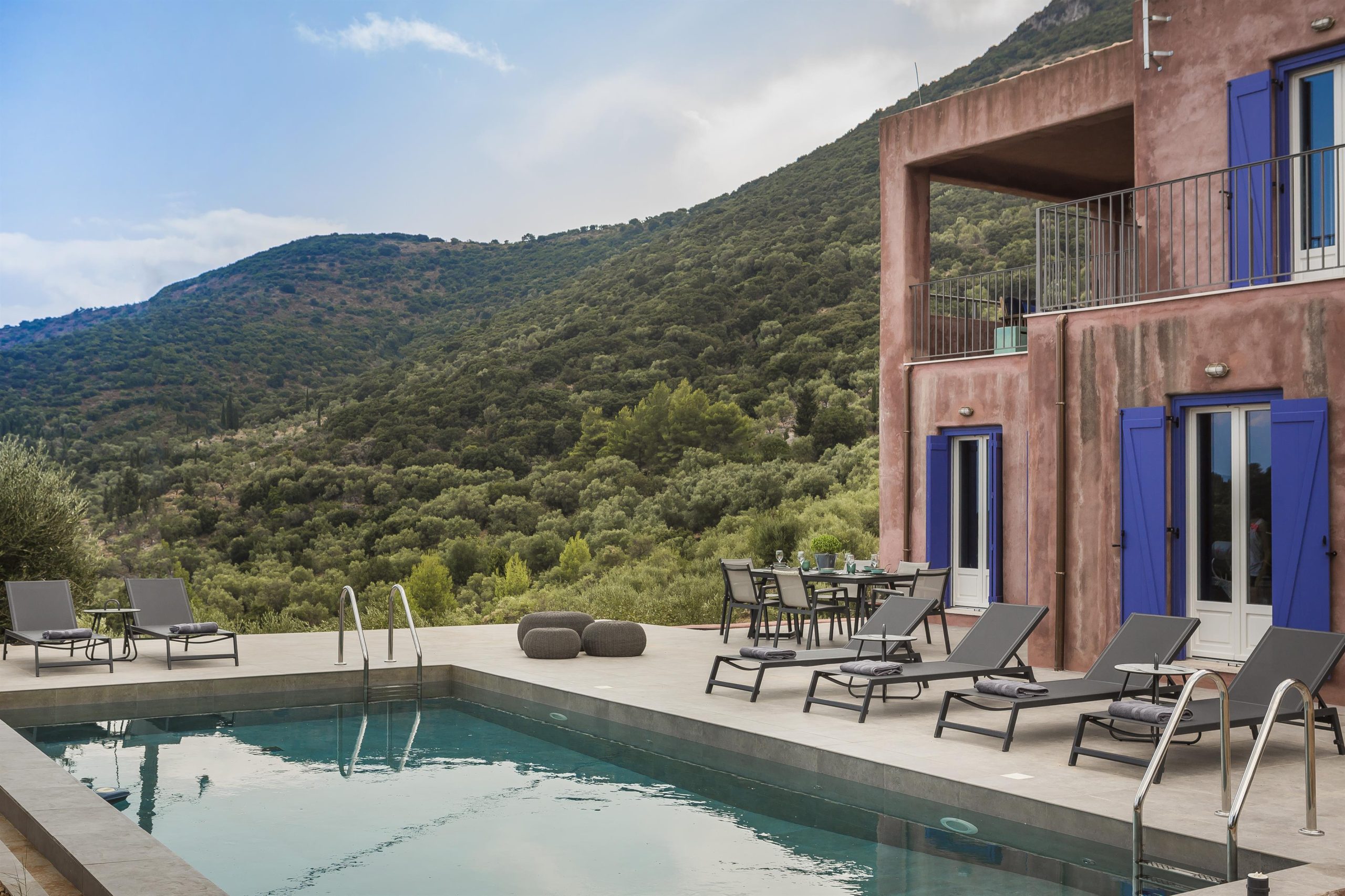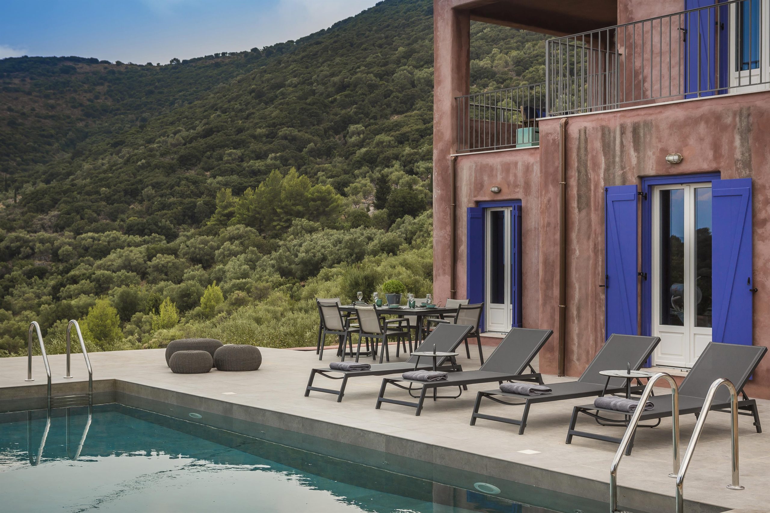 Tranquility, vibrant colors and stunning views make up the very essence of villa NADORIA. High on a hill, away from the noise of the town, villa NADORIA is perfectly integrated with the environment gazing both the friendly soothing mountains and the clear blue Ionian sea.